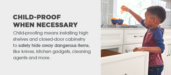 rnIf babies or toddlers live in your home, you are probably already familiar with the idea of child-proofing. In a family-friendly kitchen, child-proofing means installing high shelves and closed-door cabinetry to safely hide away dangerous items, like knives, kitchen gadgets, cleaning agents and more.