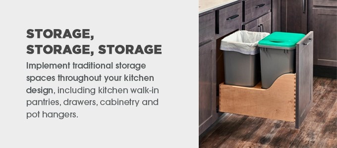 rnKitchens for families require a lot of storage space to make room for all the dishes, pantry items, pots and pans. Implement traditional storage spaces throughout your kitchen design, including kitchen walk-in pantries, drawers, cabinetry and pot hangers.