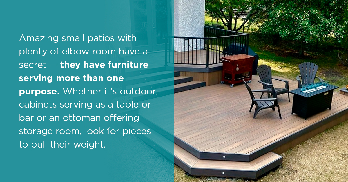rnrnrnFurniture that does double duty: Amazing small patios with plenty of elbow room have a secret — they have furniture serving more than one purpose. Whether it’s outdoor cabinets serving as a table or bar or an ottoman offering storage room, look for pieces to pull their weight.
