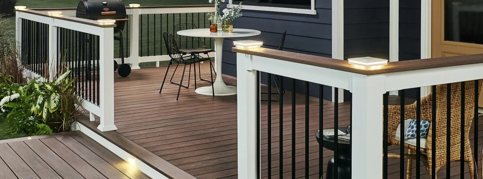 Your deck and railing styles should complement each other and your home. Decide if you want your railing to blend in or contrast with its surroundings. For example, do you want your railing to be the focal point of your deck? Look at the color of your house, the window trim or your home’s accents to choose the right deck and railing color combinations.