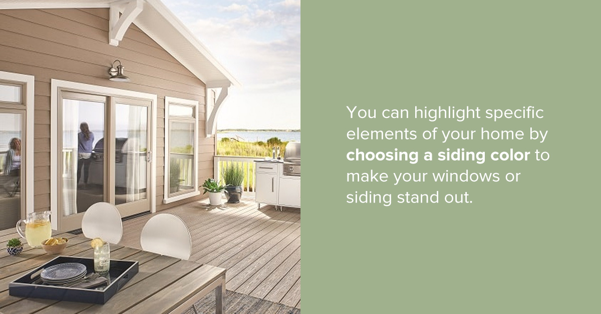 You can highlight specific elements of your home by choosing a siding color to make your windows or siding stand out. For example, if you have white trims, you can use a dark siding color to make the trimming stand out. If you want to bring attention to red bricks, you can use brown, gray or tan siding to complement the red color and make it stand out.